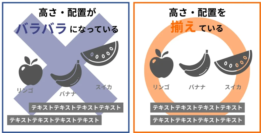 画像の大きさやテキストの位置が揃っていないと、見た目が悪いだけでなく非常に読みづらくなってしまいます。
