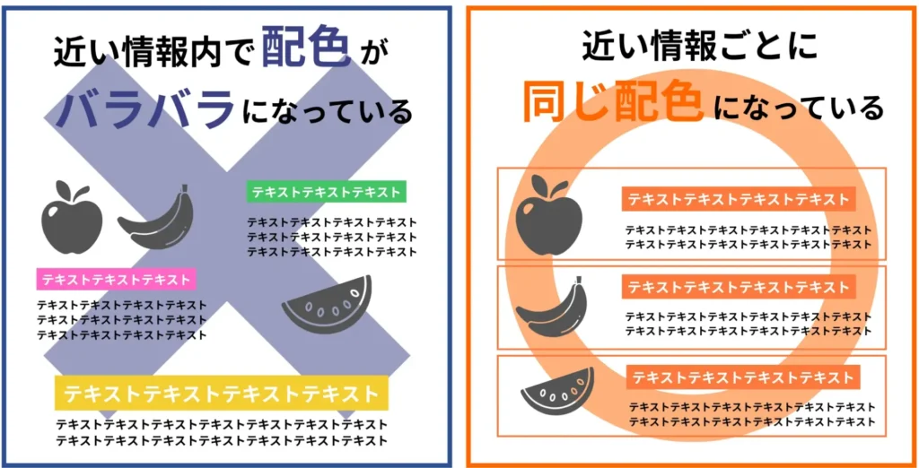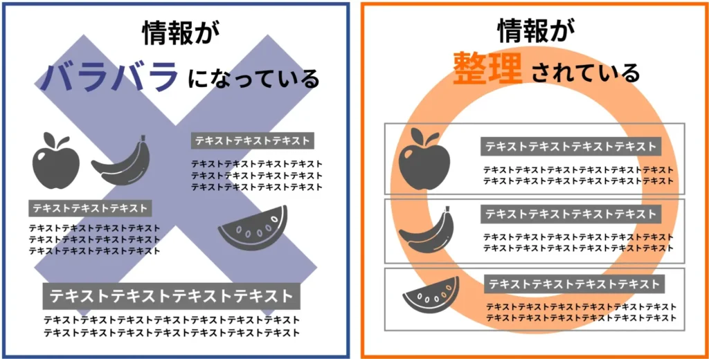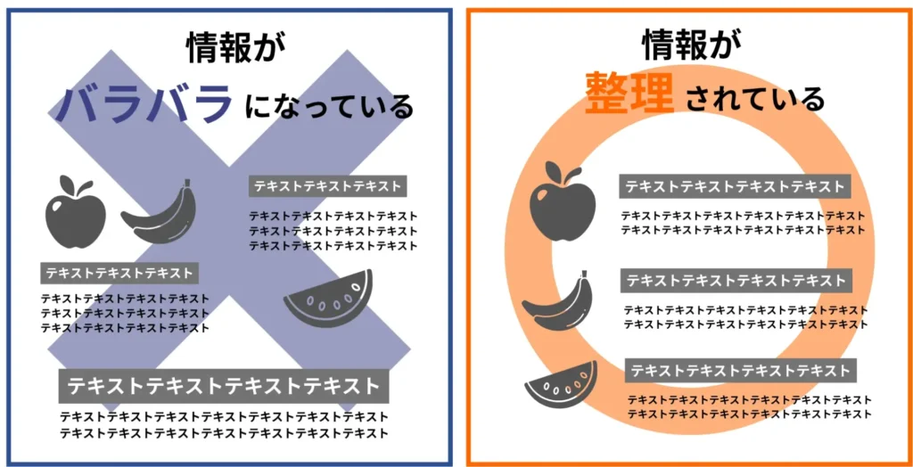 テキストや画像の情報は、出来るだけ関連性のあるものをまとめて配置しましょう。近い情報のものがまとまっていると、内容が頭に入りやすくなります。