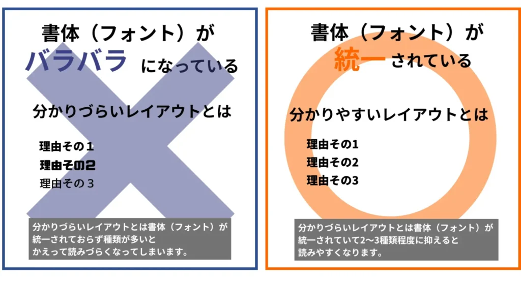 テキストに使う書体は、種類を増やし過ぎると読みづらくなってしまいます。書体は見出しと本文で2種類程度に抑えると、ぐっと読みやすくなります。