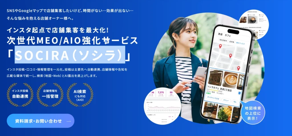 SOCIRA(ソシラ)は、Googleマップ上位の順位をモニタリングしMEO対策の進捗チェックを行うツールです。料金としては無料で利用が可能ですが、セットで運用しているGoogleMyBusiness運用サービスの利用が前提となります。