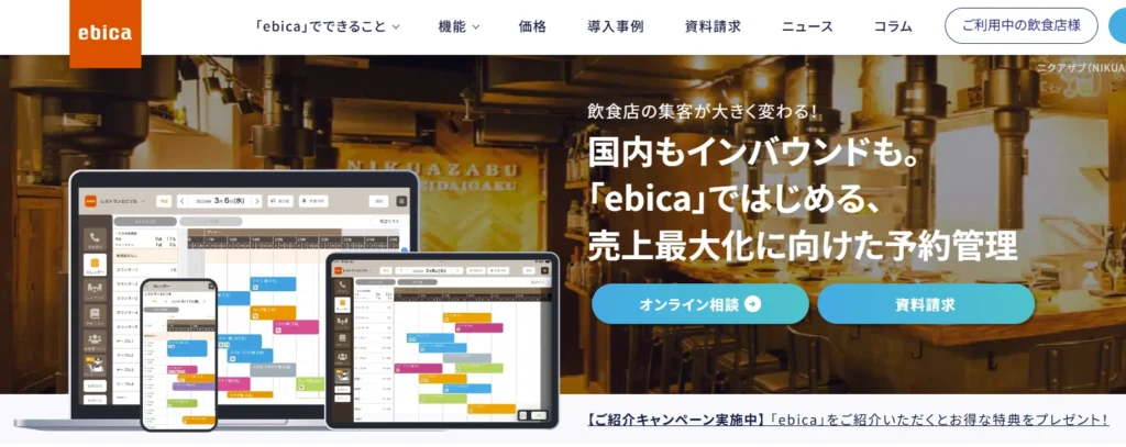 ebicaは、複数のグルメサイトやSNSを通じた予約を一元管理し、AIで自動化された電話対応機能により、店舗スタッフの負担を軽減するシステムです。手間をかけずに多くの集客チャネルを活用できるため、業務の効率が向上します。