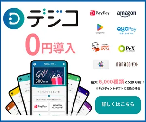 | デジコ | 0円 ※無料 | 0円 ※無料 | 金額×10% | 1円~ | 最大6,000種類 ・PayPay ・Amazon など | ー | 導入後は2時間で納品 | |