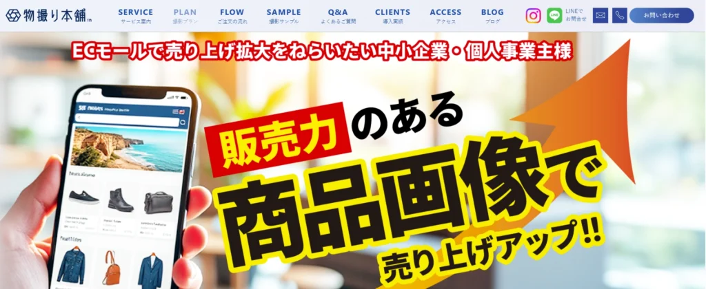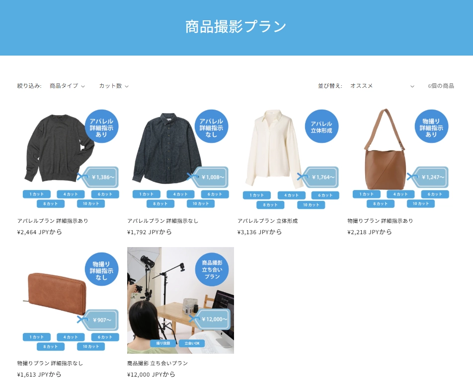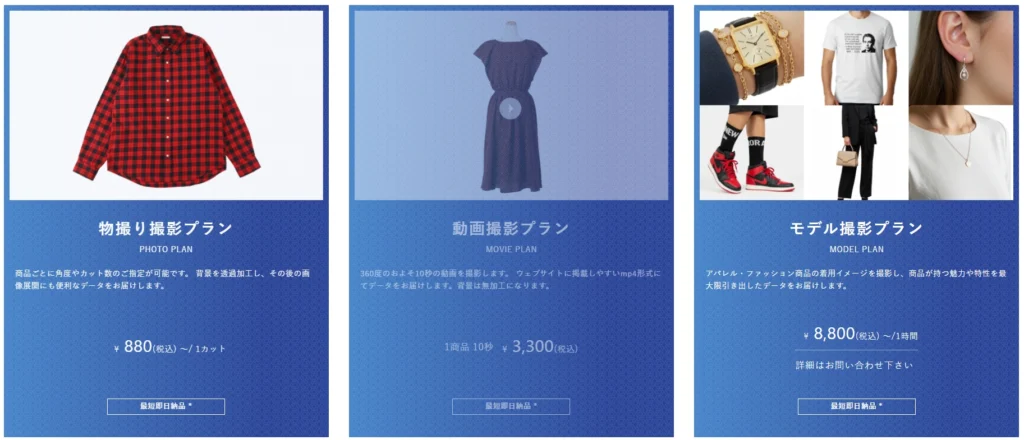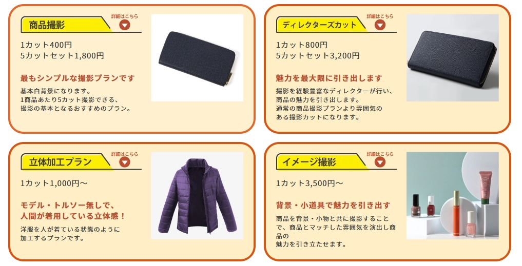 商品撮影 | 簡易撮影:2,000円~5,000円/1カット モデル・シーン撮影:5,000円~2万円/1カット | 白背景の物撮りからモデル撮影まで幅広く対応 |