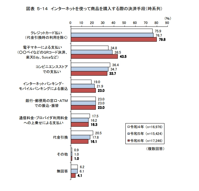2024年(令和6年)に総務省が行った調査によると、インターネット上で商品を購入した人のうち33.7%がコンビニ決済を選択しています。これはクレジットカード、電子マネーの次に多い数値です。