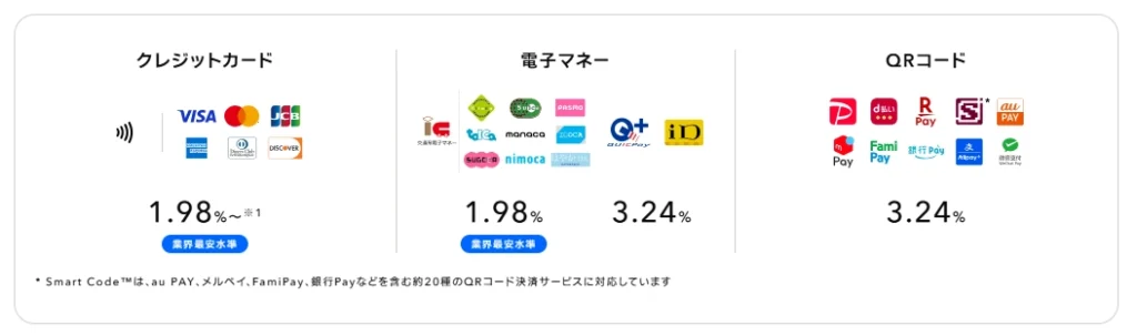 期間限定で端末代金0円※条件ありを実施することも多いです。決済手数料はクレジットカードの場合3.24%~・電子マネーの場合は1.98%と安いのが特徴です。