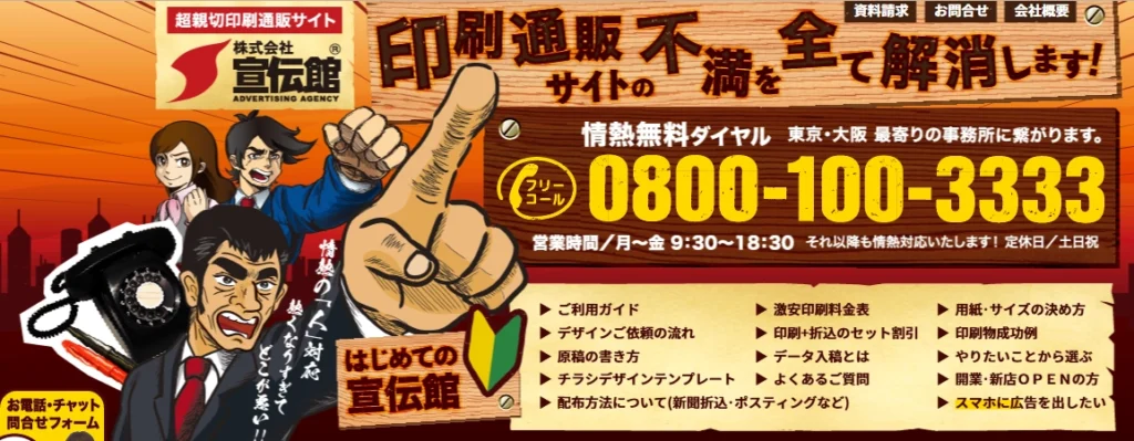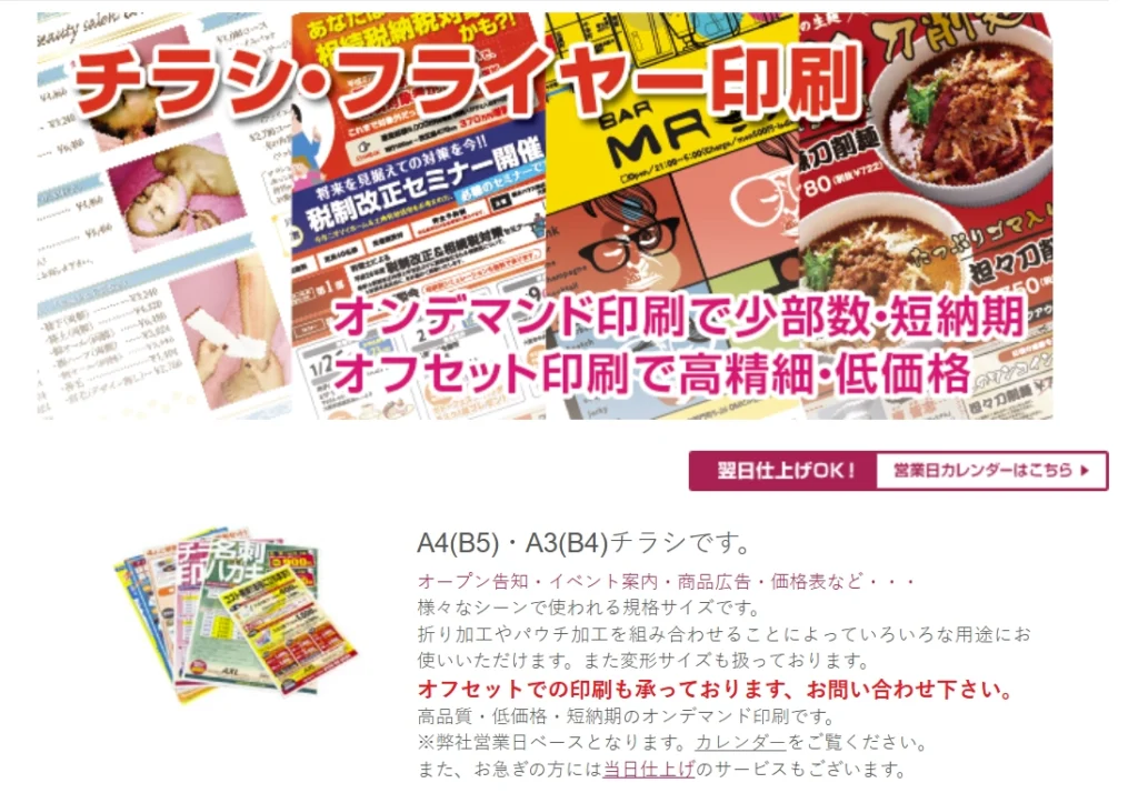 大手の印刷会社です。ユーザーにより満足してもらえるチラシが完成するように様々なサポート体制をとっています。便利さと丁寧さを掛け合わせたサービスに満足するユーザーが多くいるようです。他にも、ディスカウントセール等もあるため低価格での注文可能かつ当日に納品することも出来るスピード感も人気の理由でしょう。