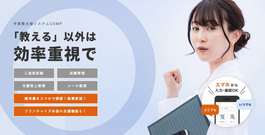 COMPは学習塾運営の効率化を目的としたクラウド型管理システムです。入退室管理や成績管理、月謝管理、メール配信など日々の塾業務を一元化できます。さらにフランチャイズ本部支援機能を備え、教材販売やロイヤリティ精算などの本部業務もシステム上で完結できます。必要な機能だけ追加できる設計で、1機能50円から利用可能な柔軟な料金体系も特徴です。モバイル対応により、保護者は請求書や成績をスマートフォンで確認でき、教室側の郵送コストの削減にもつながります。コミュニケーションと業務管理の両面から塾運営をサポートし、講師が本来の指導に集中できる環境づくりを支援します。