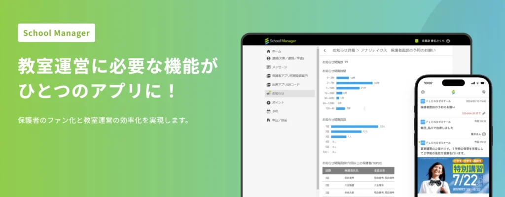 | 分析・レポート | 生徒の学習状況や教室別売上、集客データなどを自動でレポート化し、経営判断に役立つデータ分析ができる |