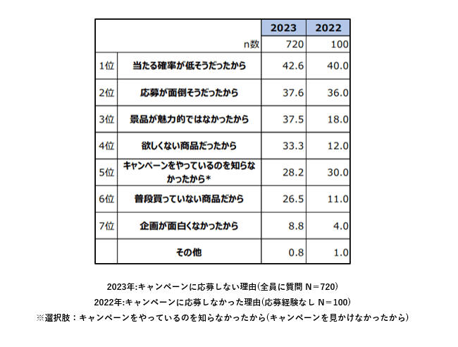 またキャンペーンに参加しない理由の2位は「応募が面倒」という点です。