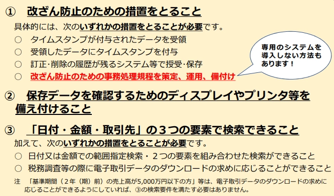 - 改ざん防止の仕組み(タイムスタンプを付与する、または事務処理規程を整備する)を取り入れる