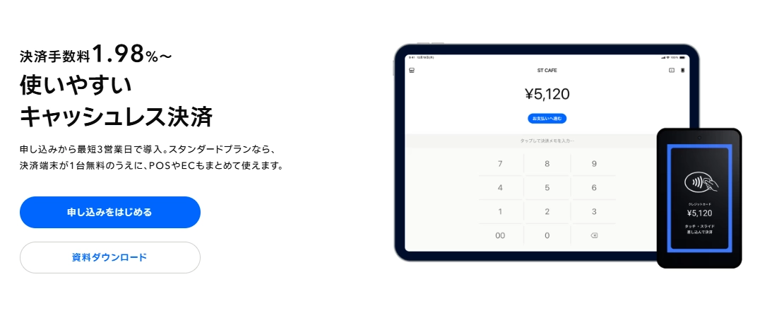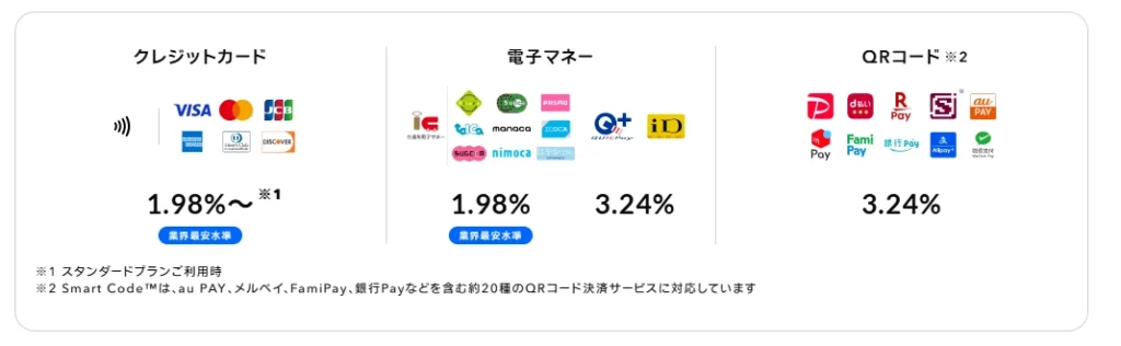 | クレカ:1.98~3.24% 交通系IC:1.98% QR:3.24% | Visa/Mastercard:1.98~2.70%(プラン別) その他クレカ:2.48~3.24% 電子マネー・QR:3.24% |