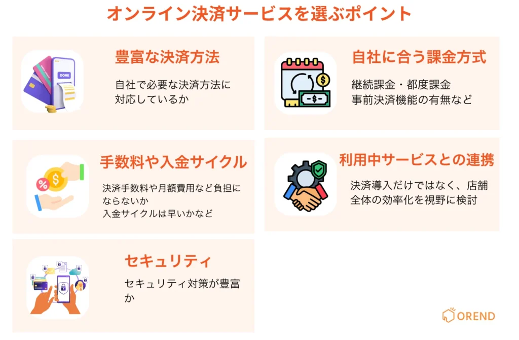 自社のビジネスモデルやターゲット層に合ったオンライン決済サービスを選ぶことで、集客や客単価アップ、業務効率化などの効果が高くなります。そのための選定ポイントを5つ紹介します。