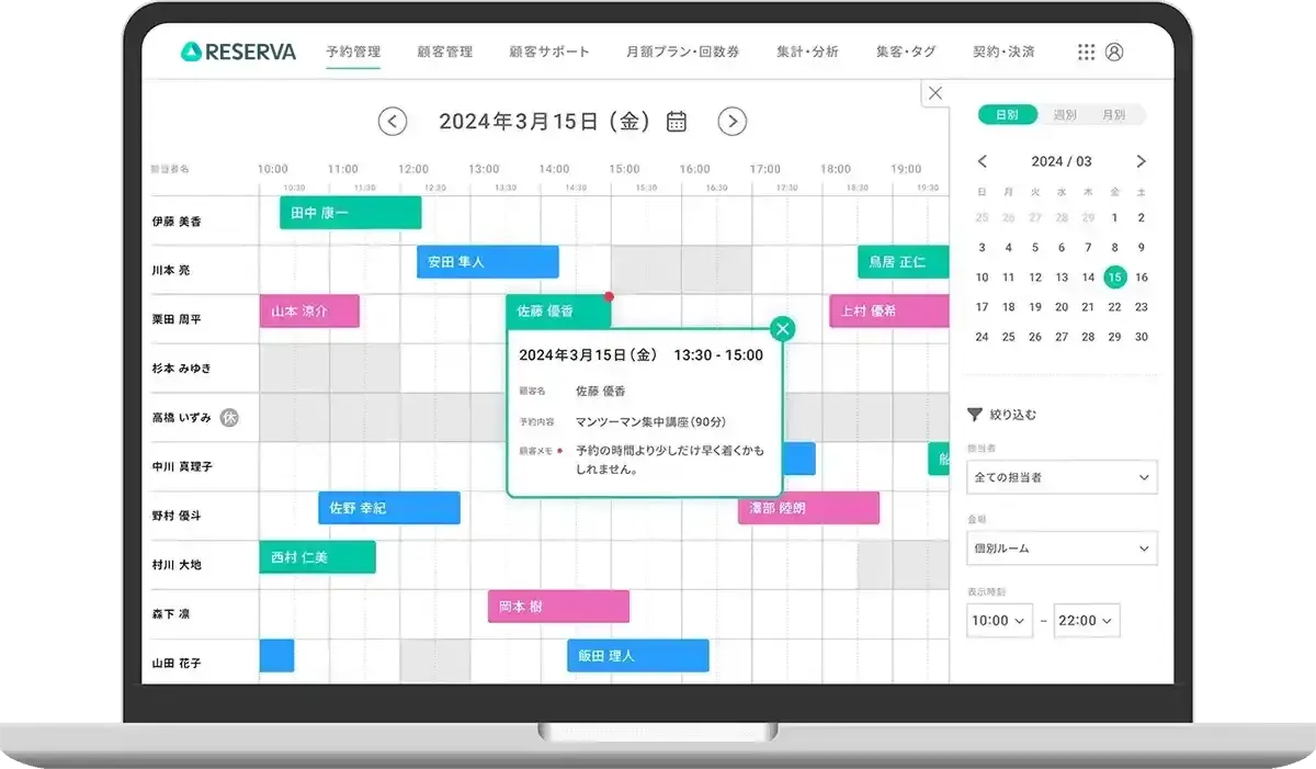 - 予約情報をPOSレジへ自動連携し、顧客・売上データもこれひとつで完結