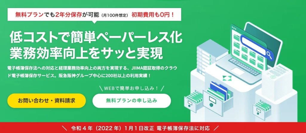 SATSAVE(サットセーブ)は、電子帳簿保存法への対応と経理業務効率向上の両方を実現する、JIIMA認証取得のクラウド電子帳簿保存サービスです。無料プランから利用開始でき、段階的にプランアップが可能。取引先も無償利用でき、クラウドサービスのためスピーディーに導入できます。阪急阪神グループを中心に200社以上の利用実績があります。