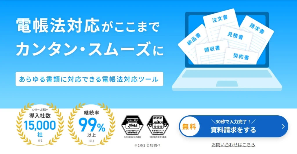 多様な帳票(契約書・見積書・請求書・領収書など)をまとめて電子保存したい企業は、このタイプを選ぶのが近道です。ポイントは、電子帳簿保存法の要件(真実性・可視性・検索性)を安定して満たせることと、検索・一元管理が直感的で運用に乗りやすいことです。以下は主要な選択肢です。