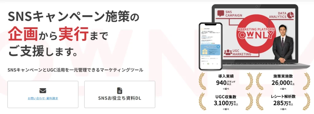 OWNLYは、SNSキャンペーンとUGCマーケティングを一つで実現できるプラットフォームです。インスタントウィン、フォロー&リポスト、レシート投稿、クイズ・診断など15種類以上のキャンペーンを定額・回数無制限で実施可能。X、Instagram、LINEなど複数SNSに対応し、UGC収集から活用まで一元管理できます。施策立案支援から広告出稿代行、事務局業務代行まで充実したサポート体制を提供。Pマーク取得済みで個人情報の取扱いも安心です。