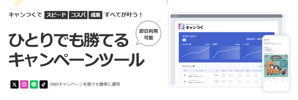 キャンつくは、誰でもSNSキャンペーン運用を実施できる簡単操作かつ高機能なキャンペーンツールです。大手企業を含む4000件超の支援実績に基づく安心サポートと、簡単設定・自動化によりコストや作業時間を大幅削減します。データ収集の自動化、高度なセキュリティ対策、当選者管理など豊富な機能でキャンペーンを効率化。スポット利用も可能で、長期利用の場合は継続的な成果向上のためのアドバイスも提供します。