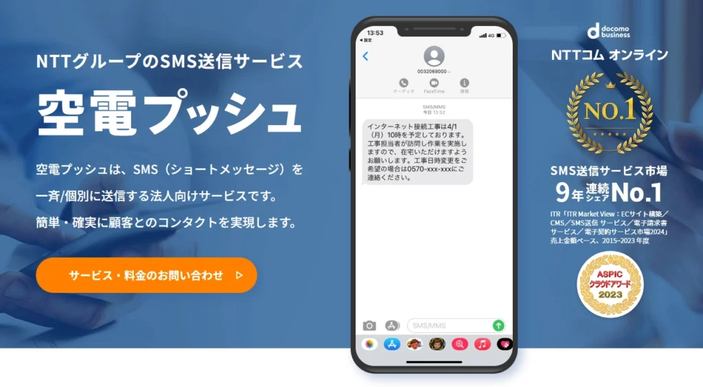 | 空電プッシュ(NTTコム オンライン) | 大手企業導入実績多数。 キャリア直収による高い到達率とAPI連携の安定性。 |