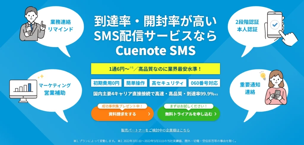 | Cuenote SMS(ユミルリンク) | 高速配信と詳細レポート機能を備えた高性能サービス。 CRM連携も容易。 |