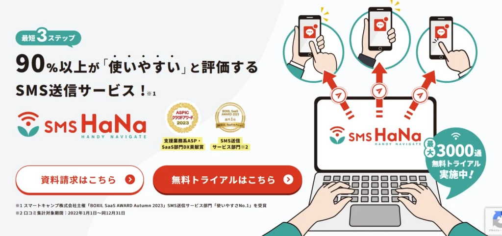 | SMS HaNa(日本テレネット) | 業務連絡やリマインドに最適。 安定性が高く、導入が容易。 |