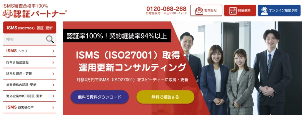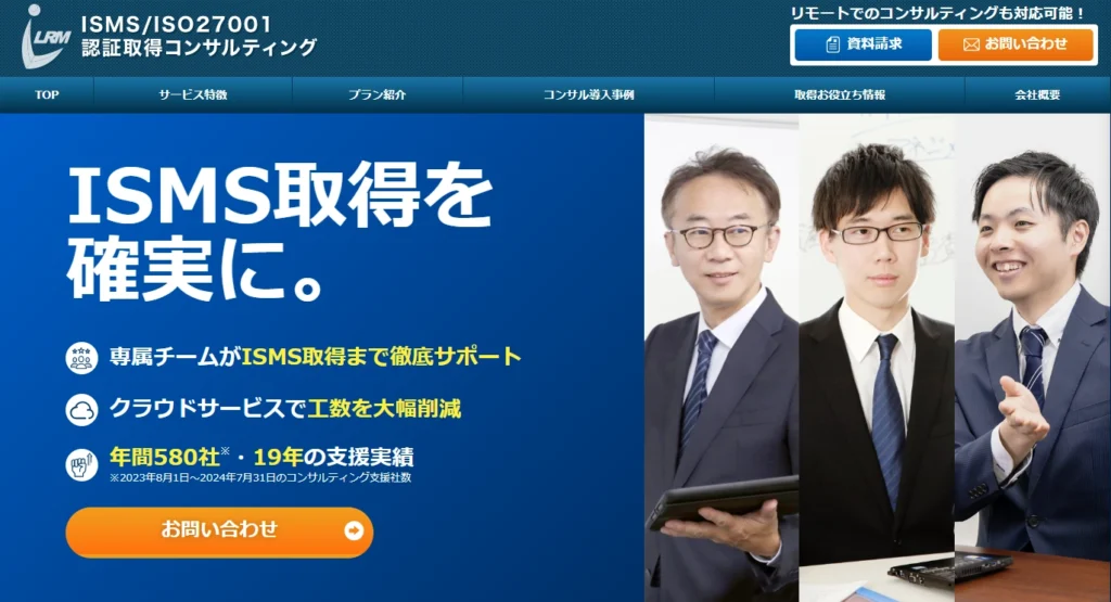 2000年創業以来、大小1,000件以上の認証取得コンサルティング実績を誇る。様々な規模の企業における支援実績に基づくノウハウに強みを持ち、業種別で検索できる豊富な事例を公開。ISO27001とプライバシーマークを中心に、各種認証取得がワンストップで可能。企業の規模やリスクに応じた情報資産の管理体制強化など、ISMS構築を主とした業務改善コンサルティングサービスを提供。「ただ認証を維持するためだけの支援」ではなく、皆様の自立運用成立を目指して支援する。