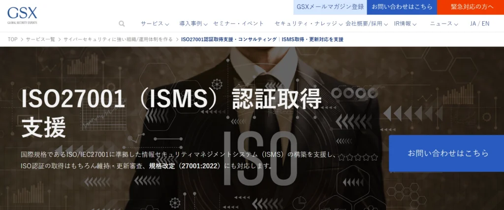 公式ホームページ:https://www.gsx.co.jp/services/cybersecurityorganization/iso27001certificationsupport.html