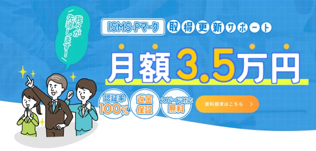 月額39,800円(税別)からのコンサルティング料金で、契約期間20か月とした明確な料金体系。3,500件のノウハウを詰め込んだひな形を用いて御社用に資料を変更・追加。専属コンサルタントが定期訪問し作業を推進。取得後もコンサルタントが定期訪問し、適切なPDCAサイクルの運用を支援。基礎から学べるセミナーや、従業員にISMSを浸透させるためのE-ラーニングといった定期教育支援、ランサムウェア対策として「標的型攻撃メール演習」も提供。