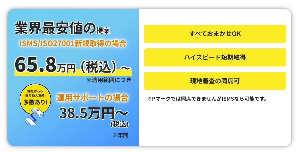 | 他規格との統合支援 | ISO9001やPマークなど、複数規格の統合マネジメント体制構築 |