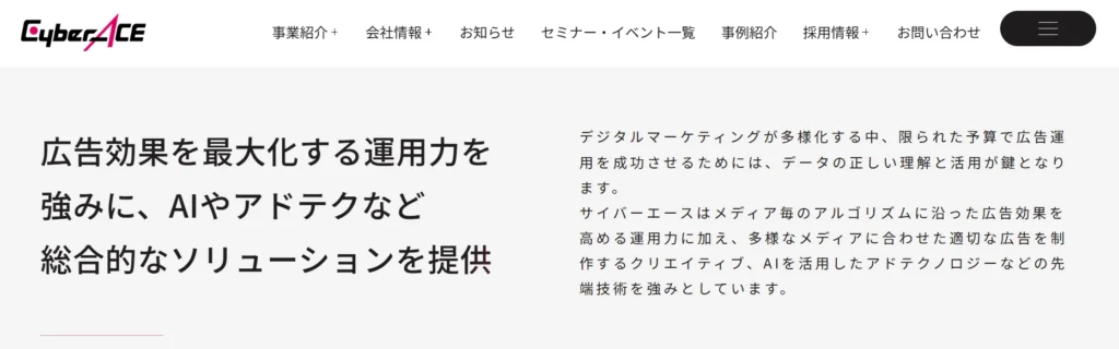 サイバーエージェントグループの強みを活かした営業組織とオペレーション体制のもと、優れた広告運用力とクリエイティブ力を発揮。メディアごとのアルゴリズムに沿った運用に加え、多様なメディアに合わせた適切な広告を制作するクリエイティブ、AIによるクリエイティブ制作体制といった先端技術も積極的に取り入れ。大手企業をはじめ、全国各地の中堅企業やスタートアップ企業まで幅広く支援。データの正しい理解と活用を重視し、効率的な広告運用を実現。