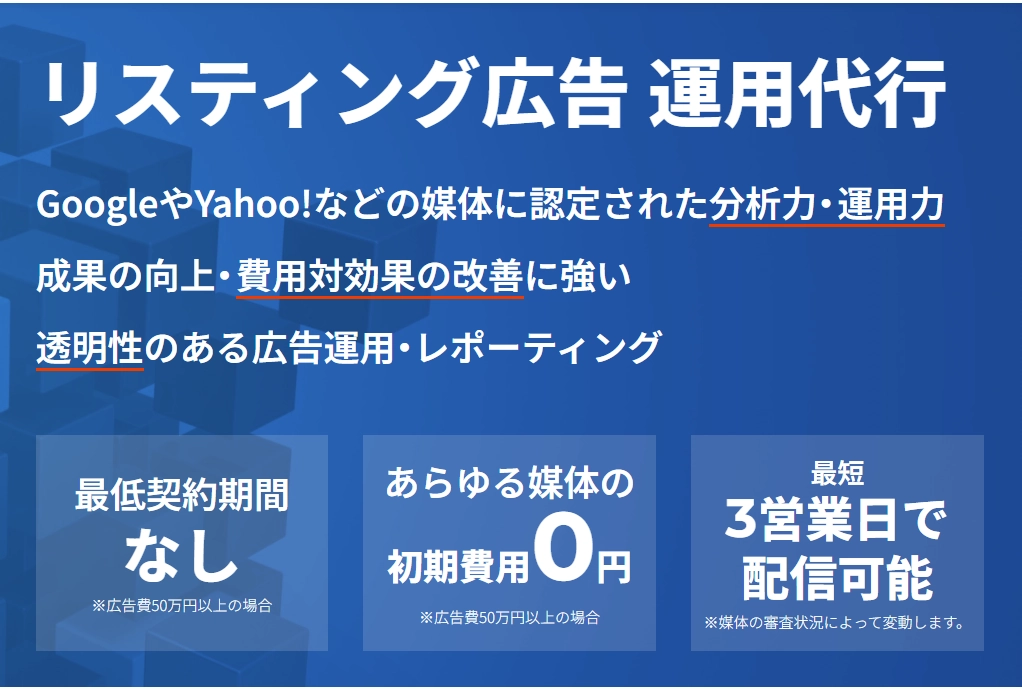 多くの代理店では、最低出稿金額(5〜10万円前後)や契約期間(3〜6か月)が設定されています。