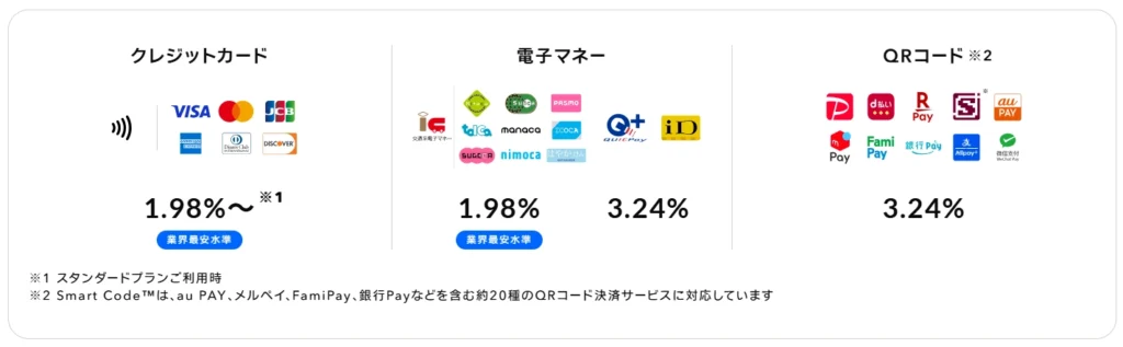 STORES決済は、Visa/Mastercardの手数料が特に低く設定されている点が強みであり、クレジットカード利用比率が高い店舗ほどコスト削減効果が期待できます。また、電子マネーは一律1.98%と比較的安く、公共交通系のIC支払いを採用する店舗では利便性が高くなります。