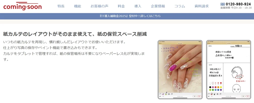電子カルテ機能に特化したタイプで、施術履歴・顧客情報・写真管理に絞って使いたいサロン向けです。予約システムやPOSレジをすでに導入している店舗では、必要な部分だけを電子化できるためコストを抑えられます。