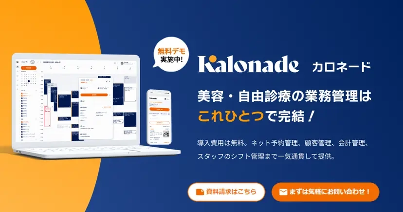 | Kalonade | 0円 | 問合せ | 写真○ 手書き× 書類管理○ | LINE◎ Web◎ 仮予約○ 一元管理◎ | POS◎ 決済◎ | KPI/売上◎ | PC/スマホ/タブレット | 予約・カルテ・会計を全部一元化する大型システム。 |