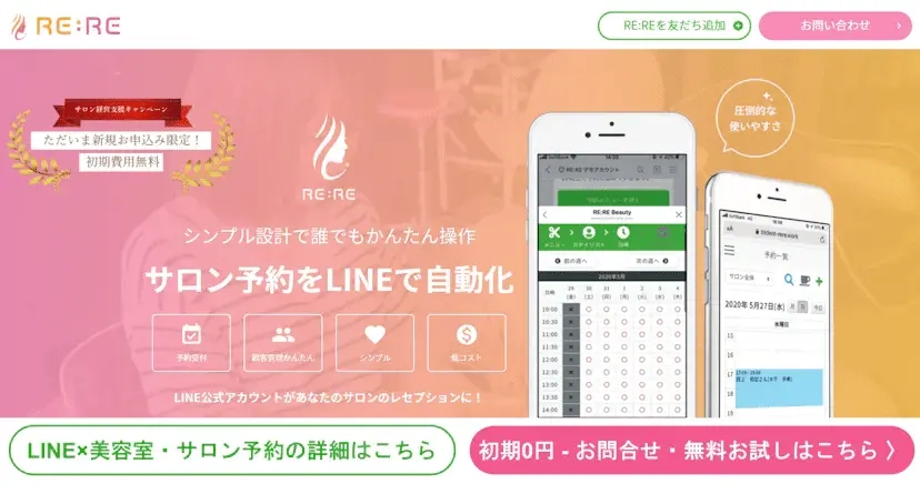 | RE:RE | 0円 | 9,800円 | 写真○(7枚) 手書き× | LINE◎ Web◎ Google連携○ | POSなし | 問合せ | ブラウザ | LINE予約に特化したシステム。 |