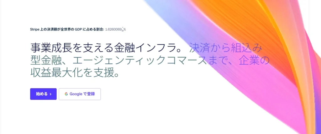 - Stripe公式サイトへアクセスし、「今すぐ始める」をクリック。