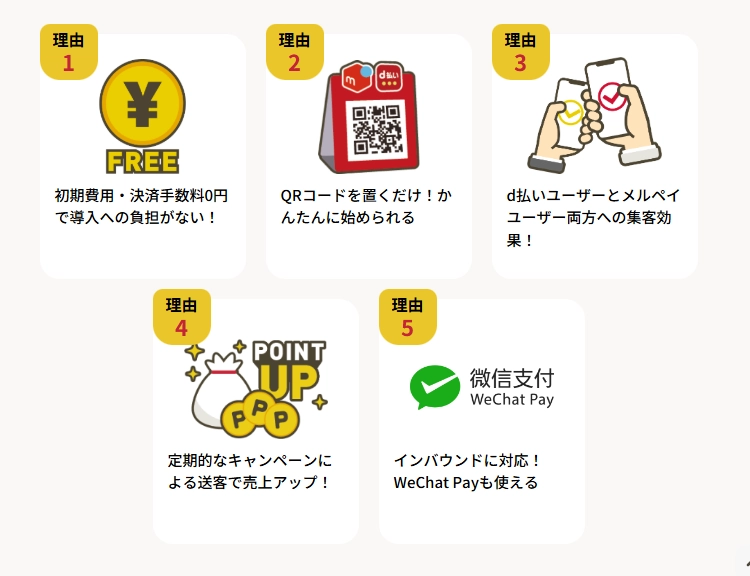 WeChat Payに対応している点も、d払いの見逃せないメリットです。訪日外国人、とくに中国圏の旅行者が使い慣れた決済手段に対応できるため、インバウンド需要を取り込みやすくなります。