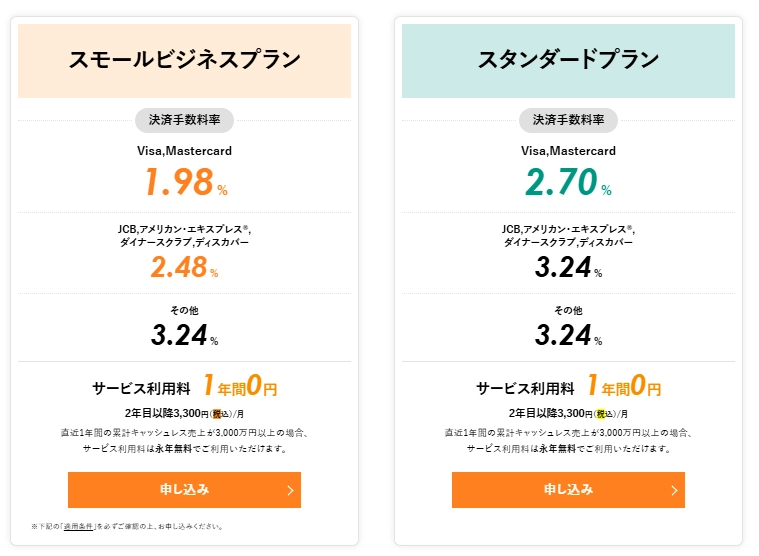 VISA・Masteracardでの支払いにかかる決済手数料が1.98%と格安なのもポイントです。翌年度以降直近1年間の累計キャッシュレス決済売上高が3,000万円以下の場合は月額費用3,300円(税込)がかかりますが、決済手数料1.98%は他社サービスと比べてもかなり安いです。