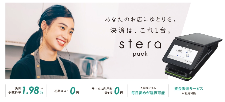 stera pack | ![]() | 4.63 | 0円 | 初年度:0円 2年目以降:3,300円(税込) 直近1年間キャッシュレス売上 累計3,000万円以上で永年無料 | クレカ:1.98%~ 電子マネー:3.24% QRコード:3.24% | 三井住友銀行口座: 0円 その他金融機関: 220円(税込) | 毎日締め(2営業日後払い) 月6回締め(2営業日後払い) 月2回締め(2 営業日後払い) 月2回締め(15日後払い) | 最短約2週間 | 契約期間:3年間 違約金:無料※ ※ 解約申請から45日以内に 端末の返却が条件 | 0円 ※レンタル | レシートプリンター内蔵 電子サイン対応 |