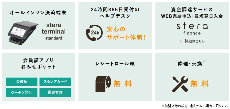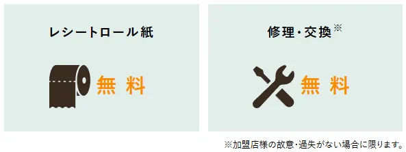 しかも、端末が故障した場合、故意・過失がなければ永年無料で修理してもらえます。レシートロールや修理費などの細かな費用が発生しないのも、stera packの魅力です。